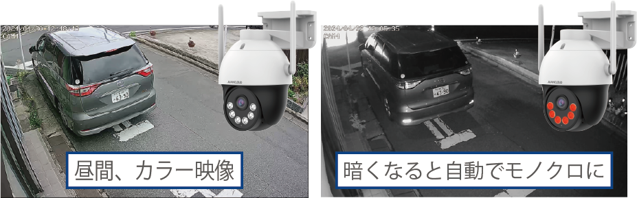 ICRは赤外線カットフィルターの略で、昼夜の切り替え時に使用されます。昼間はフィルターを使って色を正確に再現し、夜間はフィルターを取り外して赤外線撮影(モノクロ映像)を可能にします。この機能により、昼夜を問わず高品質な映像を提供することができます。Juancloudのカメラは、暗さを自動で判別して、昼夜の切り替えを行っています。「暗くなっても赤外線撮影にしない」という利用者のニーズに応じて、モードを柔軟に切り替えることが可能です。