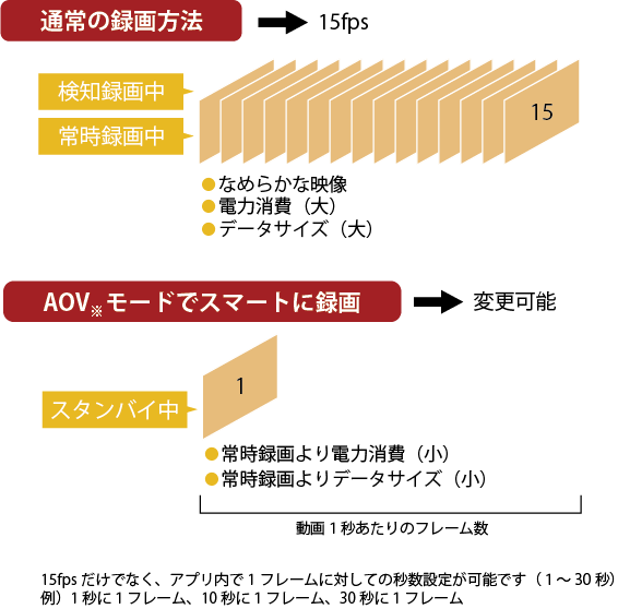 フレームレートは、1秒あたりの画像の枚数を示し、通常はfps(frames per second)で表現されます。一般的なフレームレートは30fpsですが、高速な動体を捉える場合は60fpsや120fpsが必要になることがあります。高いフレームレートは滑らかな映像を提供し、動きのあるシーンでもブレが少なくなります。特に、スポーツやイベントの録画においては、フレームレートが重要な要素となります。Juancloudのカメラは15fpsとなります。バッテリー内蔵のカメラ(JA-HSD2241-AP-4G)においては、電力消費を極力抑えるために、常時録画はするが15秒に1枚などに落とすことが可能です。(AOV)