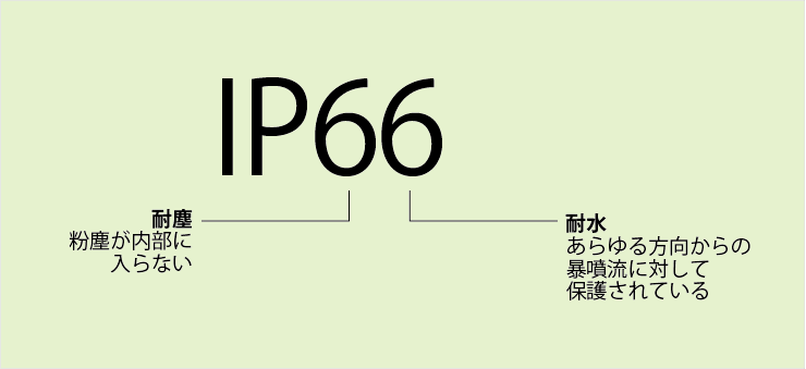 IP66は、防塵・防水性能を示す規格です。「IP」は「Ingress Protection」の略で、左側の「6」は完全に防塵であること、右側の「6」は強い水流からも保護されていることを意味します。右側が「7」の場合は、一時的に水中に沈めても保護されていることを示します。屋外の防犯カメラにとって、IP66の規格は非常に重要で、雨や埃からの保護が求められます。Juancloudの屋外カメラはすべてIP66となりますので、浸水(水没)には対応しておりません。カメラ本体は屋外での使用は問題ございませんが、アダプターやケーブルのつなぎ目などは、雨などに濡れないようにお願いします。アダプターは露出用ボックスに入れてご利用ください。ケーブルのつなぎ目はブチルテープ(自己融着テープ)で保護してください。